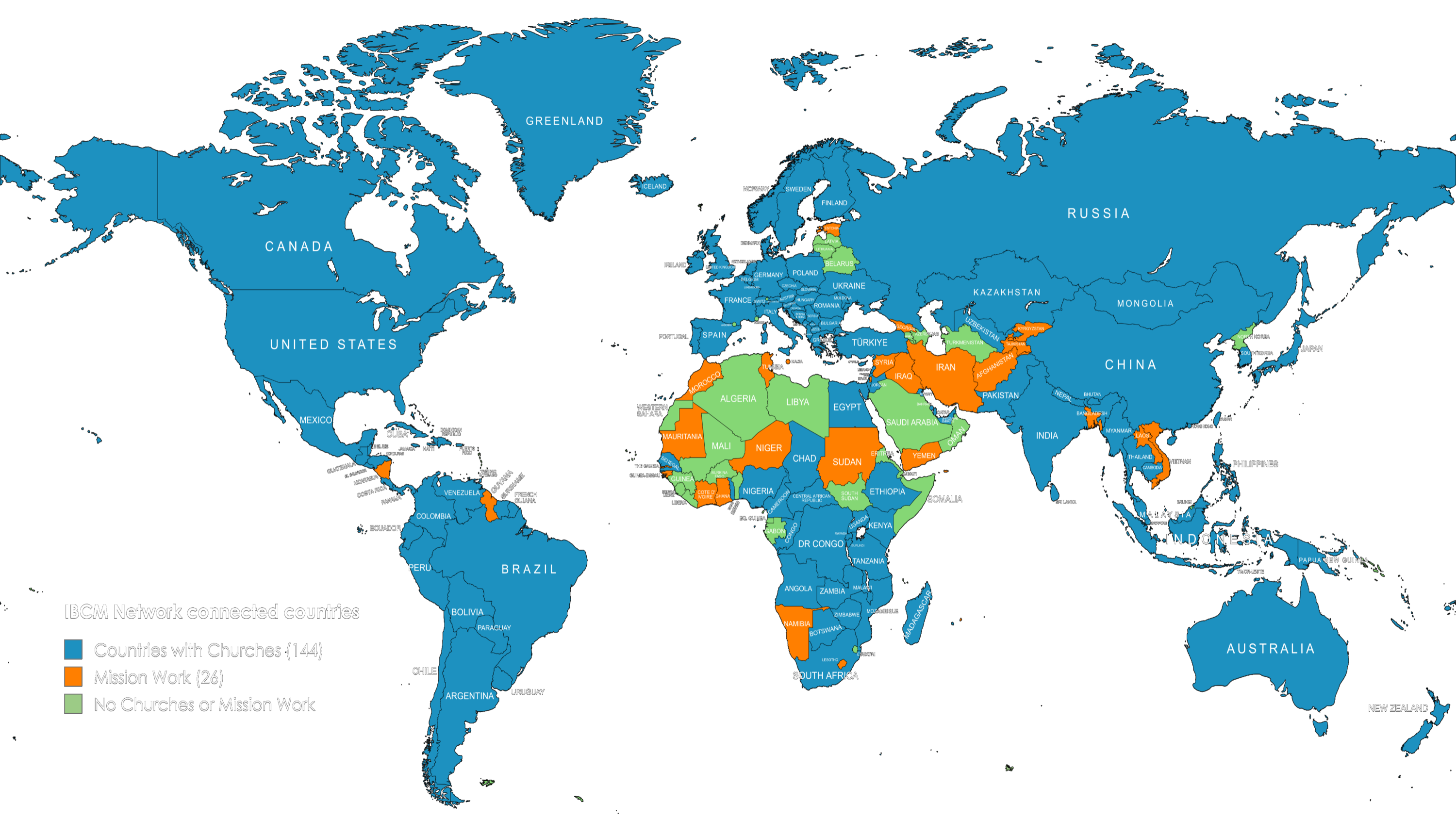 IBCM Network serves churches and organisations in over 170 countries across the world. See the countries in blue in the map below. Each country name in blue in the list below is linked to further national information.